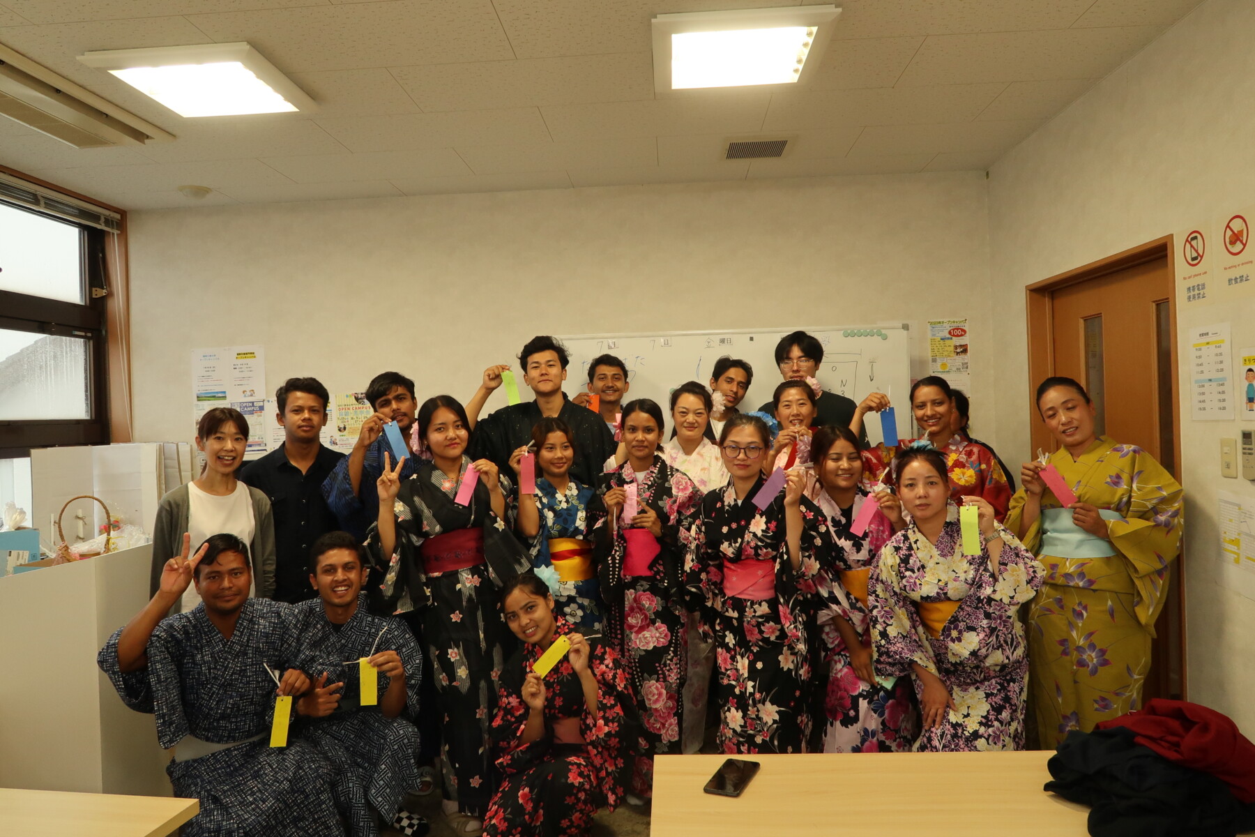七夕まつり 2023 2023/07/19 7月7日に、七夕まつりを行いました。 みんなで、浴衣を着て写真を撮ったり、飾りを作ったりしました。 あいにくの雨でしたが。みんな、初めて着る浴衣にとても喜んでいました。 短冊には、それぞれみんなの願い事を書いてもらいました。 みなさんは、どんな願い事を書きましたか。みなさんの願い事が叶うといいですね。